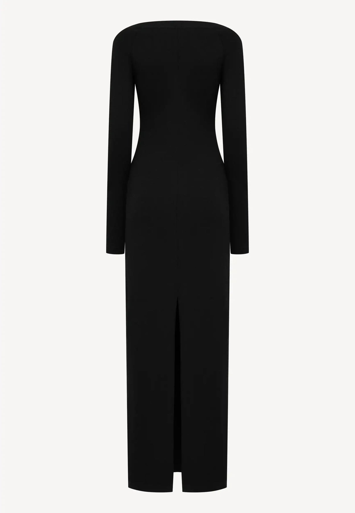 A long, fitted dress made of stretch cotton with a V-neck. Simple and minimalist, yet memorable thanks to its off-the-shoulder design and a vertical slit at the back of the hem. Perfect for when your look needs to be both comfortable and elegant.