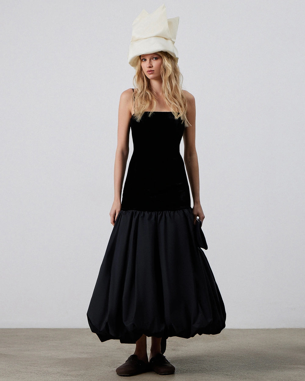 An evening corset dress with a balloon skirt. The bodice, crafted from glossy black velvet, highlights the waist and shoulder line, while the voluminous skirt made from dense textured fabric creates a striking silhouette. The main idea behind the design was to achieve maximum comfort without compromising the classic corset aesthetic: the perfect fit is ensured not by boning but through meticulous tailoring and sturdy adjustable ribbons that allow for precise control of the desired level of support.