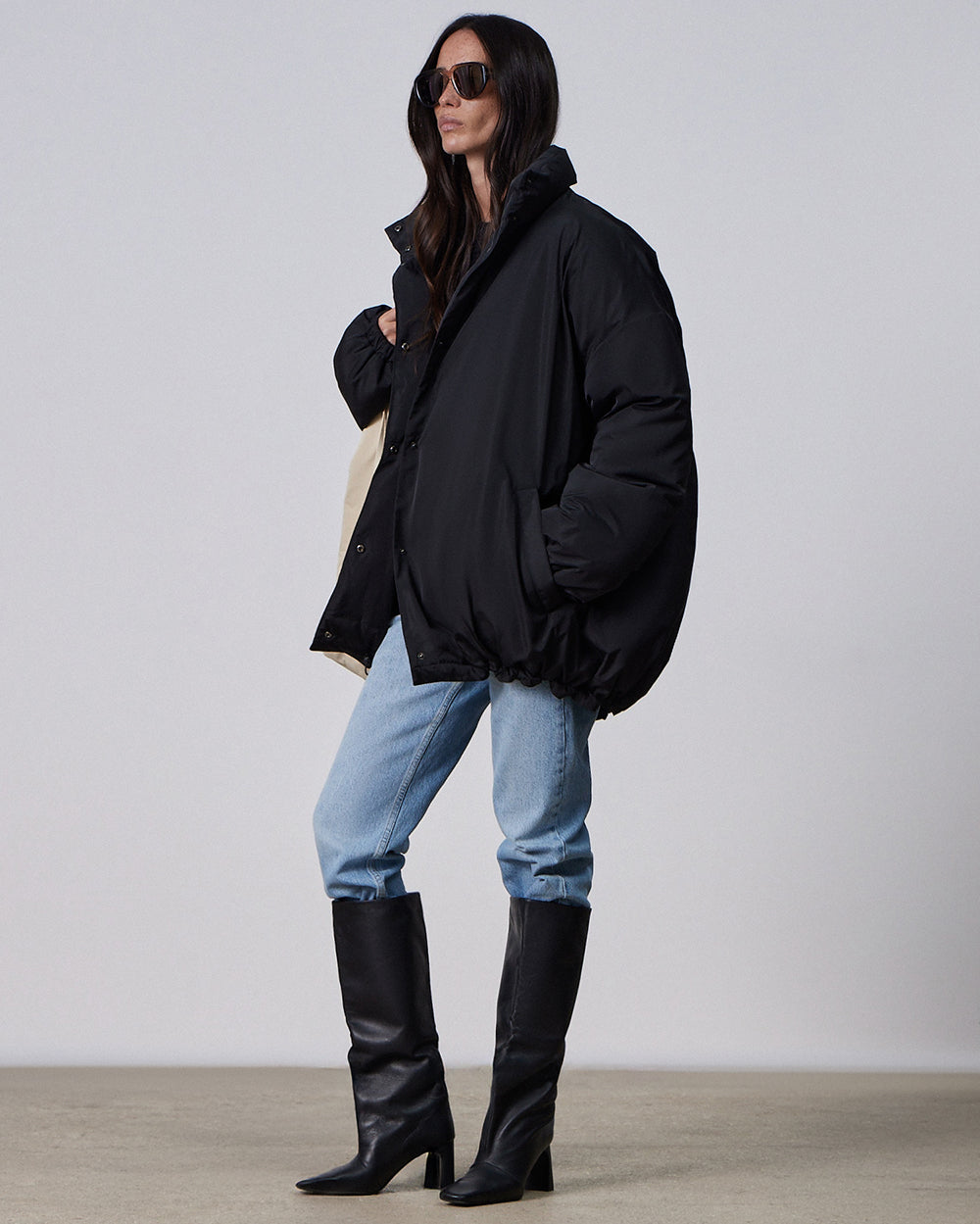 An oversized puffer jacket with a stand-up collar in black. Maximizes warmth retention thanks to its filling of natural down and feathers. The gathered lower edge, framed by an elastic band, adds extra volume and protects against wind. Dropped shoulder line emphasizes the relaxed silhouette, while the same-color button fastening serves as an additional design accent.