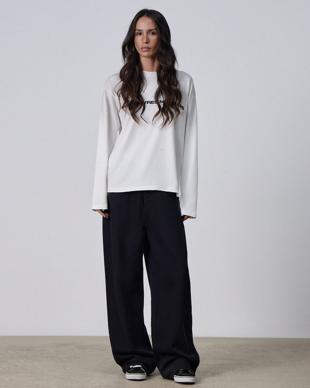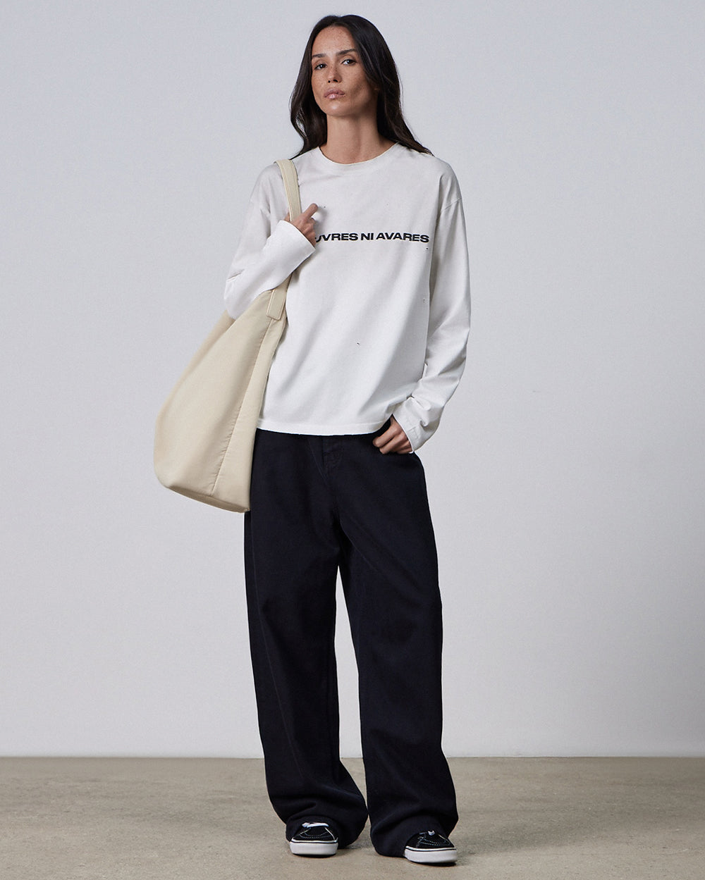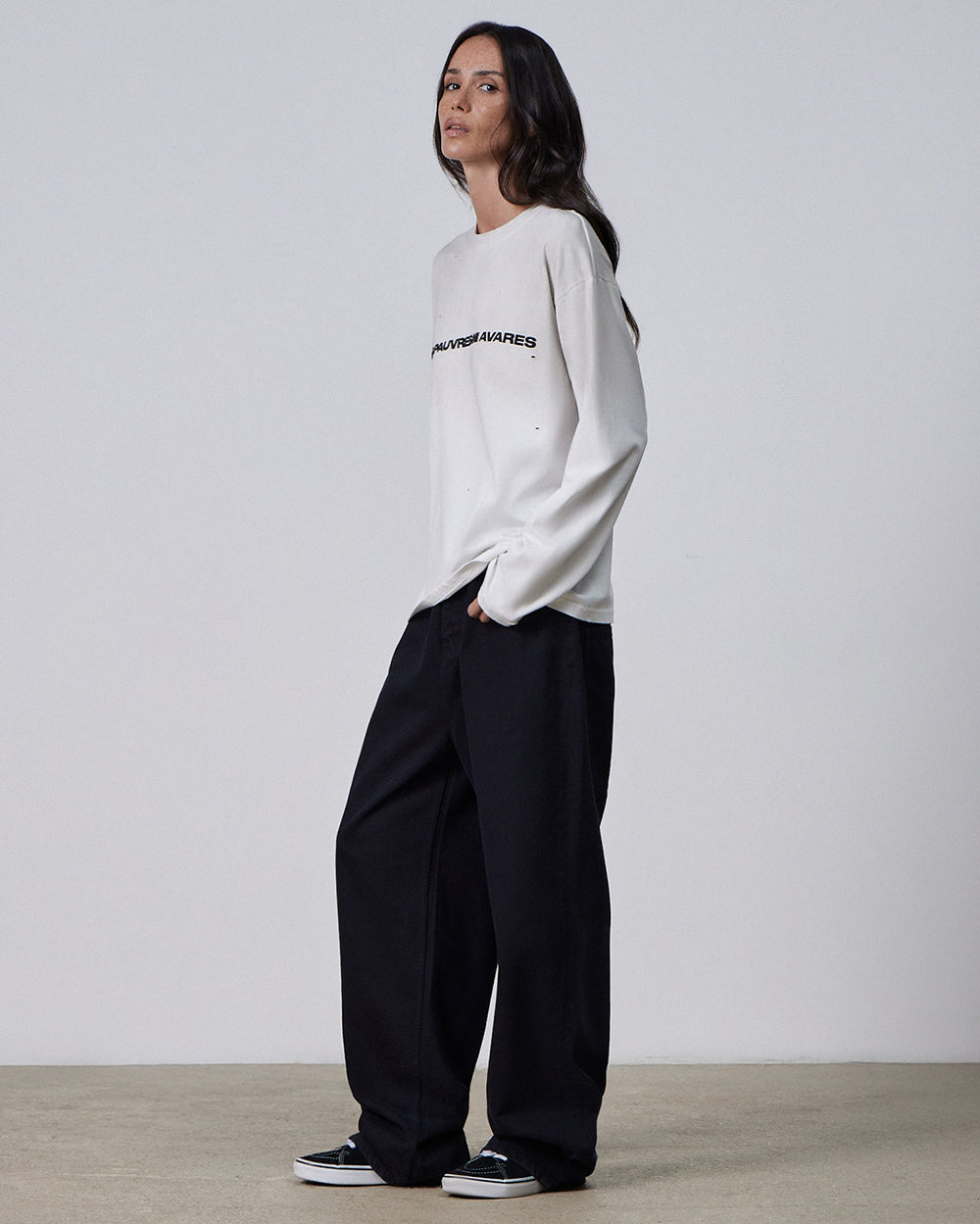A loose-fitting cotton long-sleeve top in a grunge style with a print blending shades of white and grey. Effortless comfort meets stylish versatility through its simple yet flattering straight-cut silhouette, enhancing every look by lending it both distinction and vibrancy. Crafted with cutting-edge technology, the embossed lettering stands proudly above the fabric’s surface, creating tactile appeal. Embellished further by artfully placed distressed cuts scattered over the entire garment and along its edges, each piece exhibits individual character with subtle color variations and streaks, reflecting the intentional irregularities inherent in our specialized dying method.