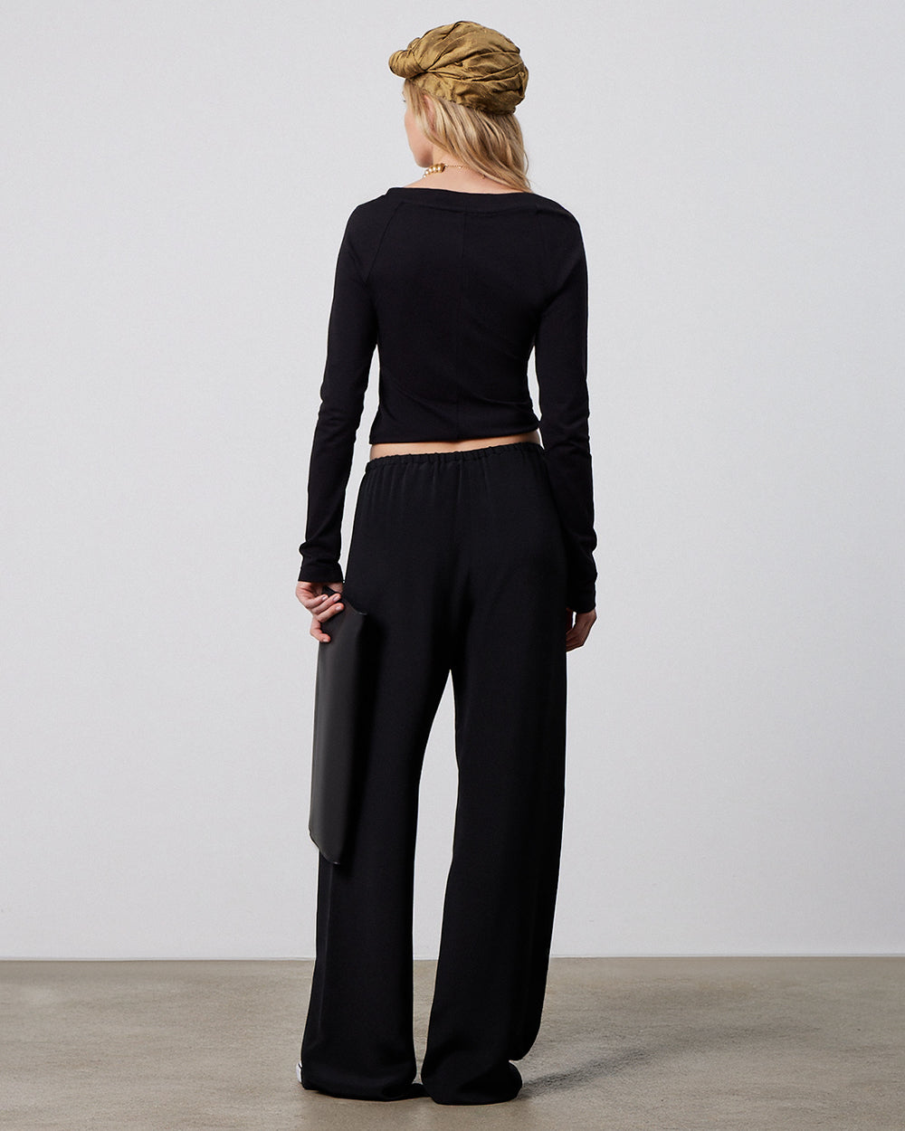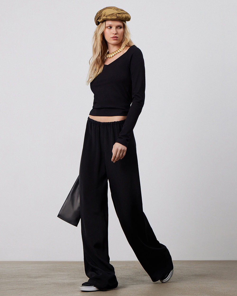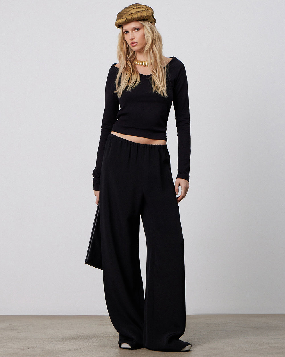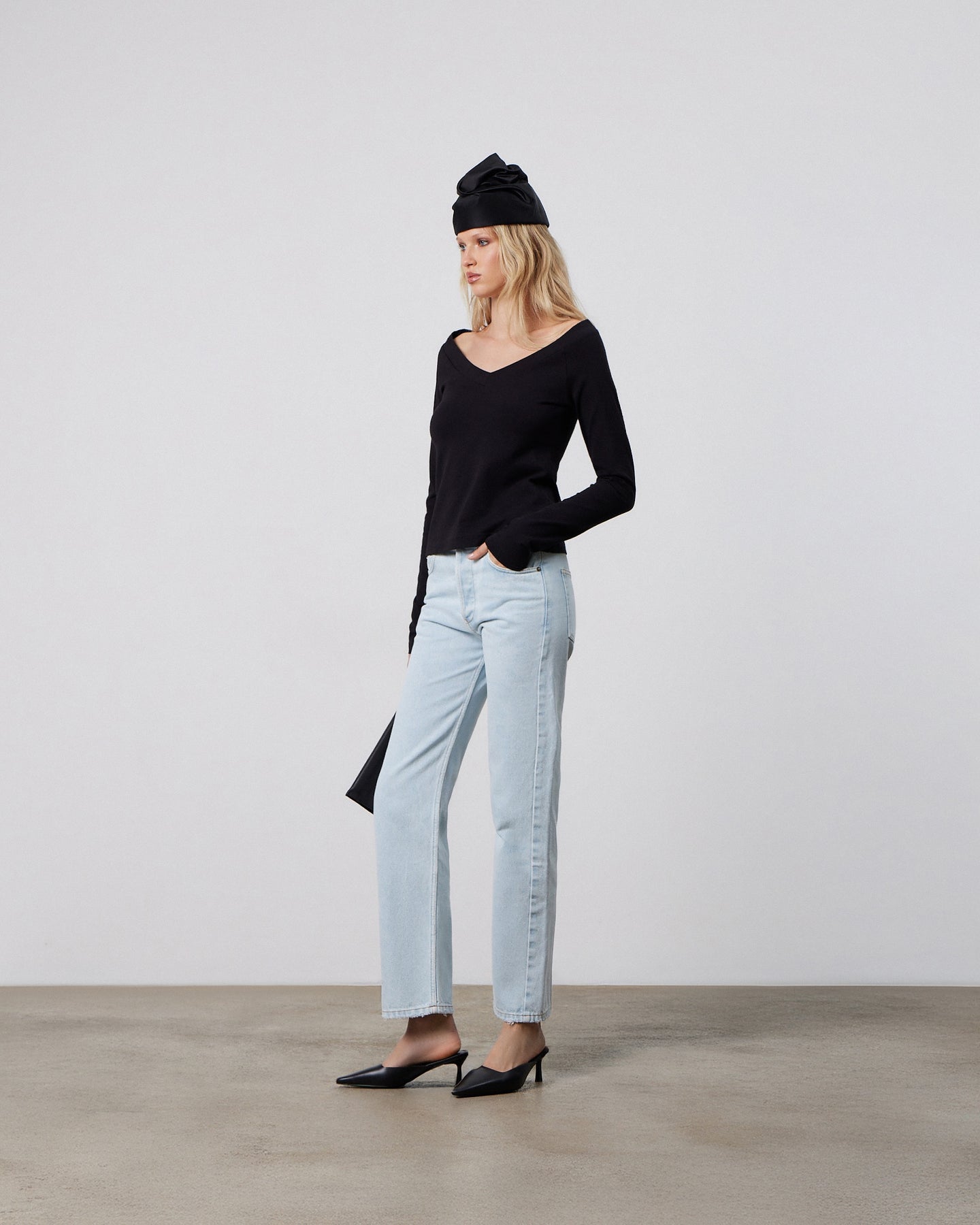 A cropped, fitted longsleeve made of stretch cotton with a V-neck. The subtly dropped shoulder line creates a relaxed, effortless look, beautifully framing the neck and collarbones. The material provides ultimate comfort for everyday outings.