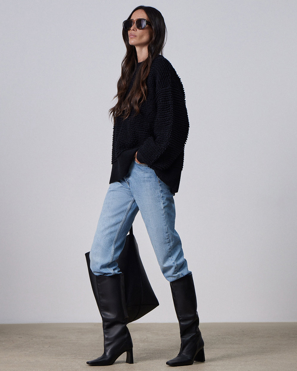 A loose-fitting sweater with long sleeves crafted from textured yarn in black. Warm and voluminous, made from a blend of wool and cashmere, it promises to be your go-to companion for the upcoming winter. Thanks to its thick fabric and extraordinary texture, this garment will keep you snug even in the severest frost - the warm air nestles between the thick fibers, offering impenetrable protection against cold winds.