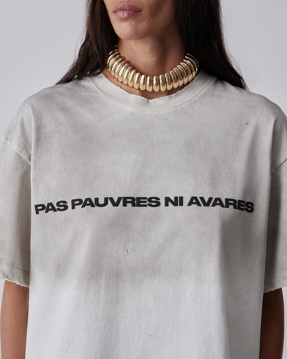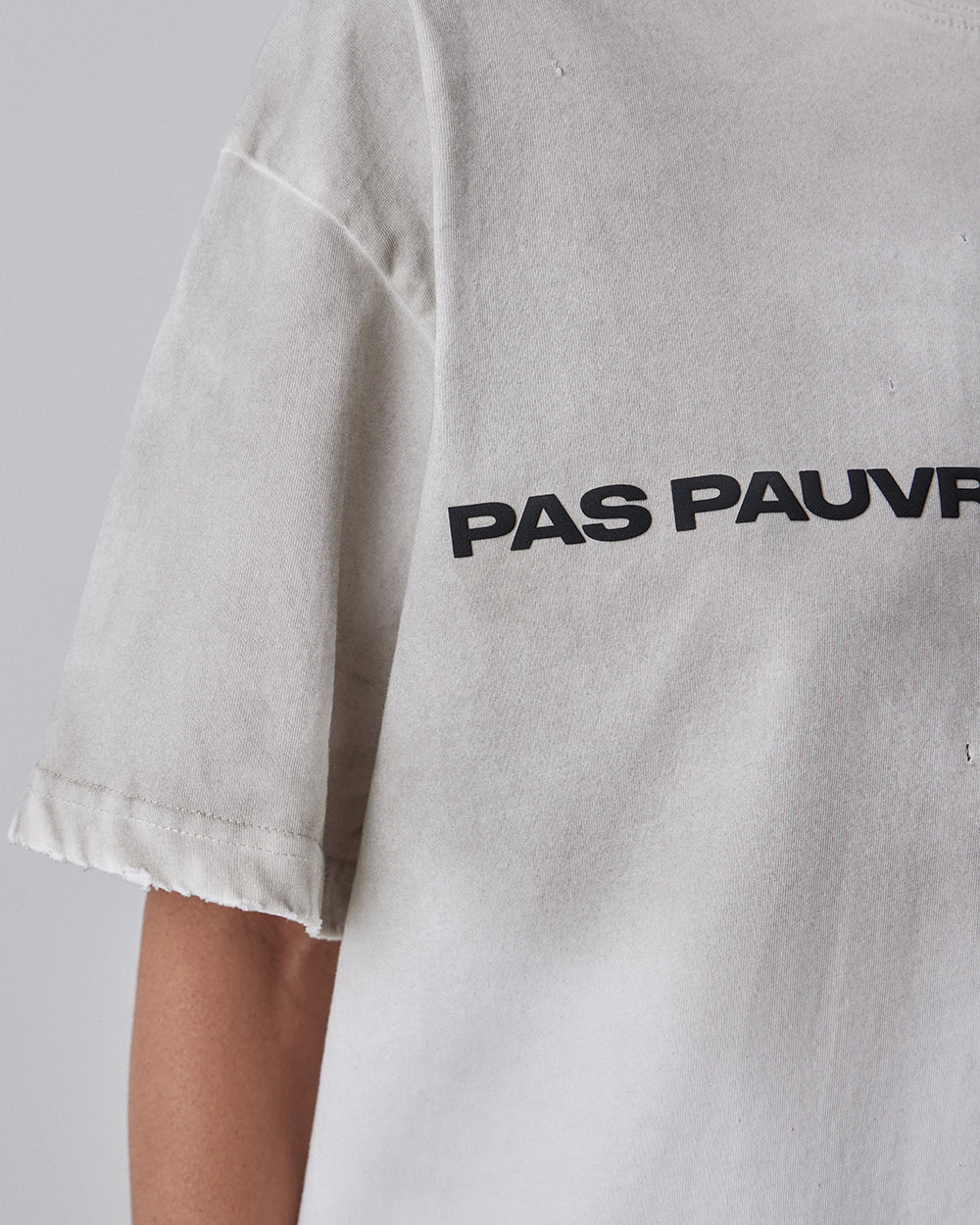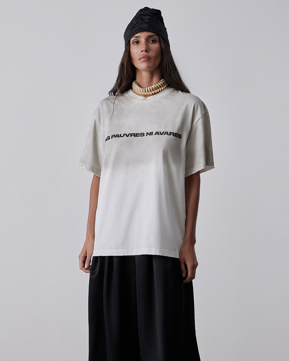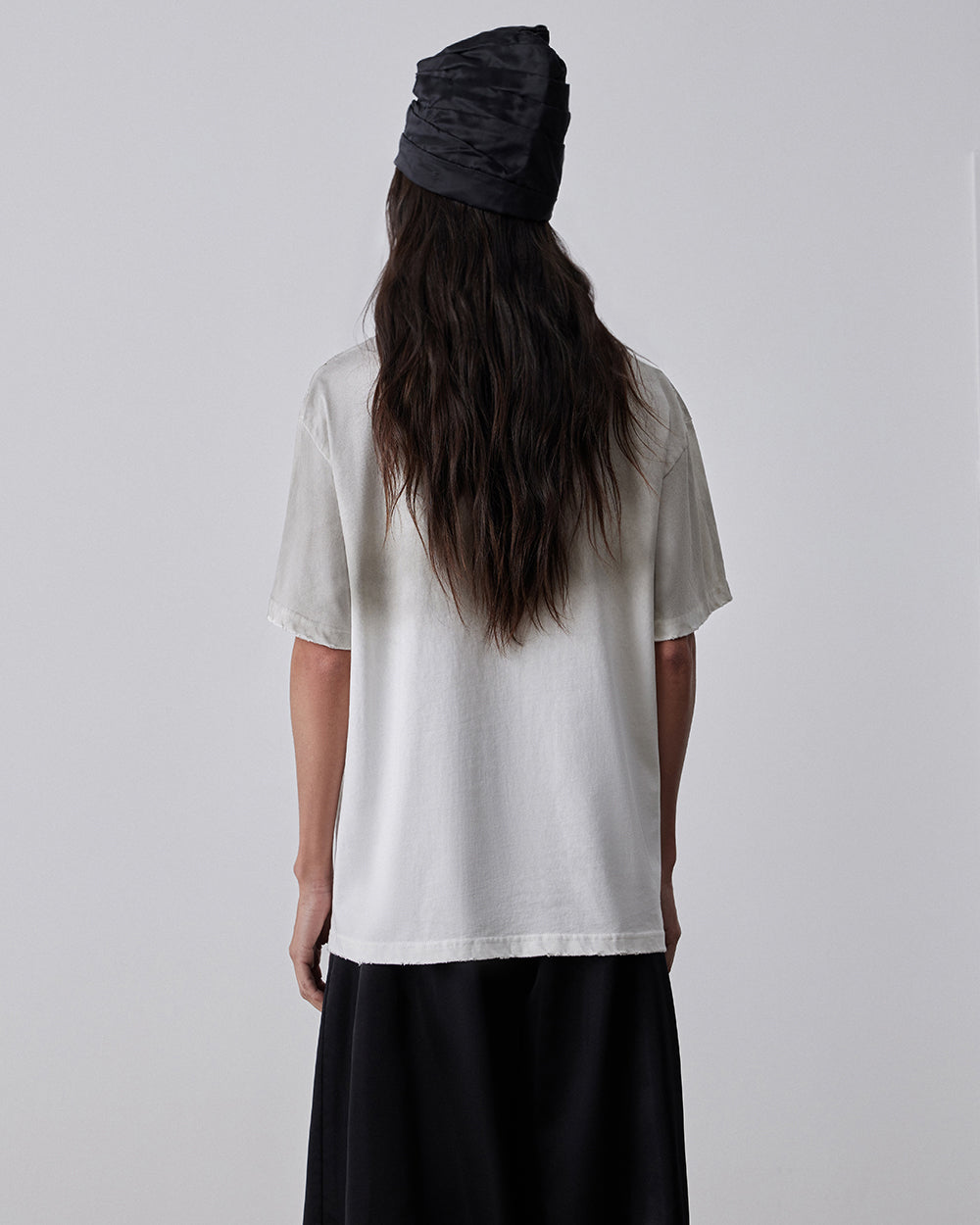 A relaxed cotton t-shirt in a grunge style featuring a gradient white-to-grey print. Lightweight and versatile, this easy-to-wear design fits effortlessly into any outfit, adding a distinctive touch of brightness and recognition. The lettering is raised above the fabric's surface thanks to an innovative application technique that gives it depth and dimensionality. Decorative slits are scattered across the entire garment and along its hems for added visual interest. Each piece may have slight variations in color intensity or contain subtle lighter/darker streaks resulting from our unique dyeing process.