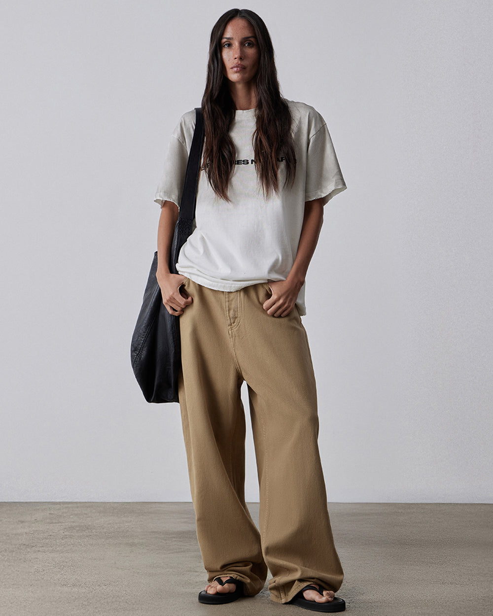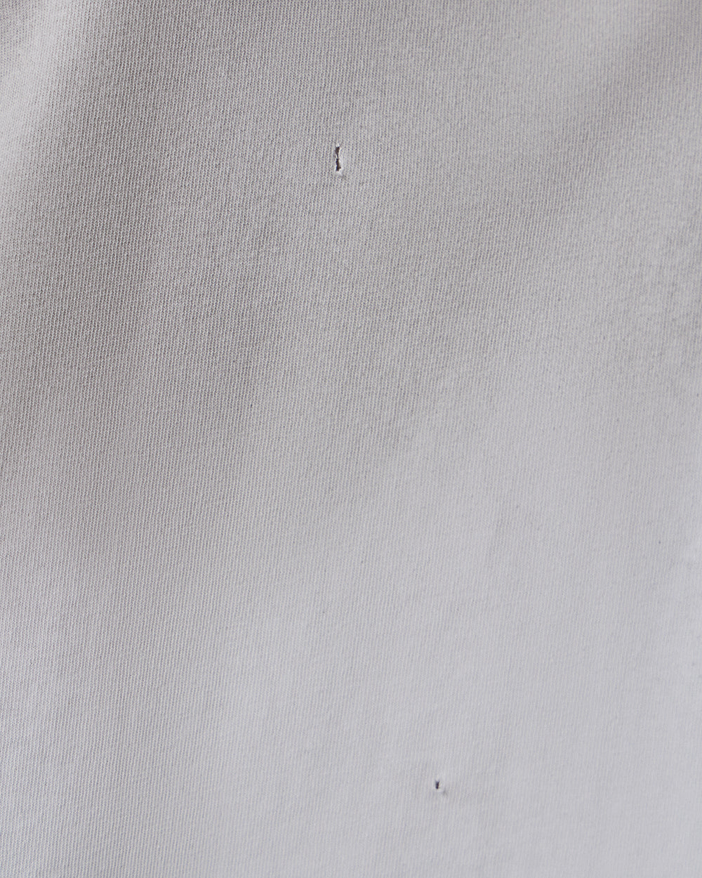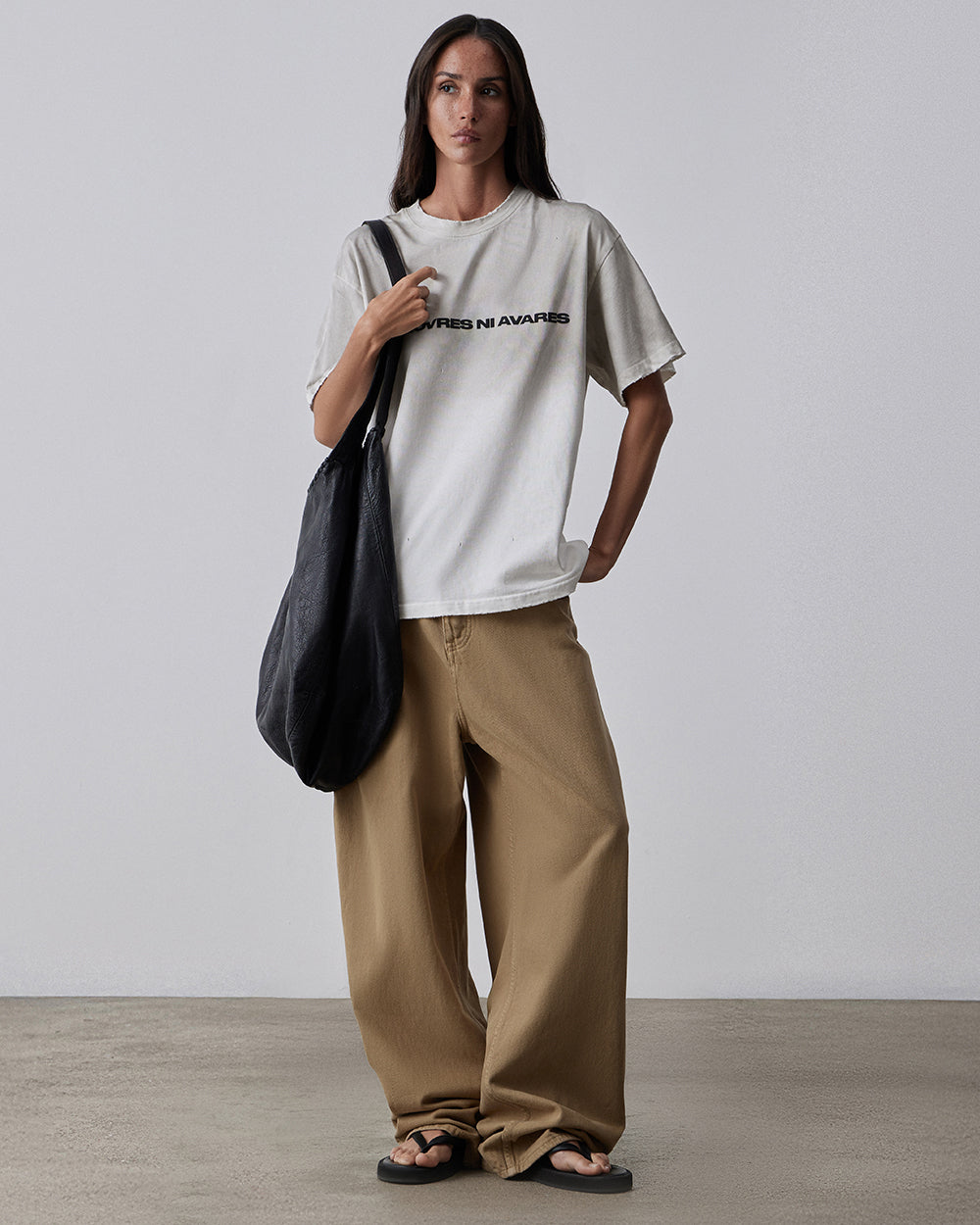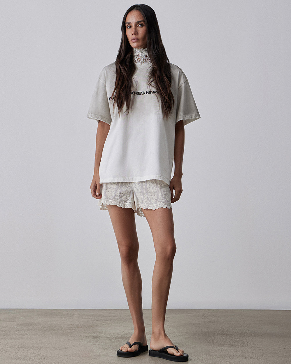 A relaxed cotton t-shirt in a grunge style featuring a gradient white-to-grey print. Lightweight and versatile, this easy-to-wear design fits effortlessly into any outfit, adding a distinctive touch of brightness and recognition. The lettering is raised above the fabric's surface thanks to an innovative application technique that gives it depth and dimensionality. Decorative slits are scattered across the entire garment and along its hems for added visual interest. Each piece may have slight variations in color intensity or contain subtle lighter/darker streaks resulting from our unique dyeing process.