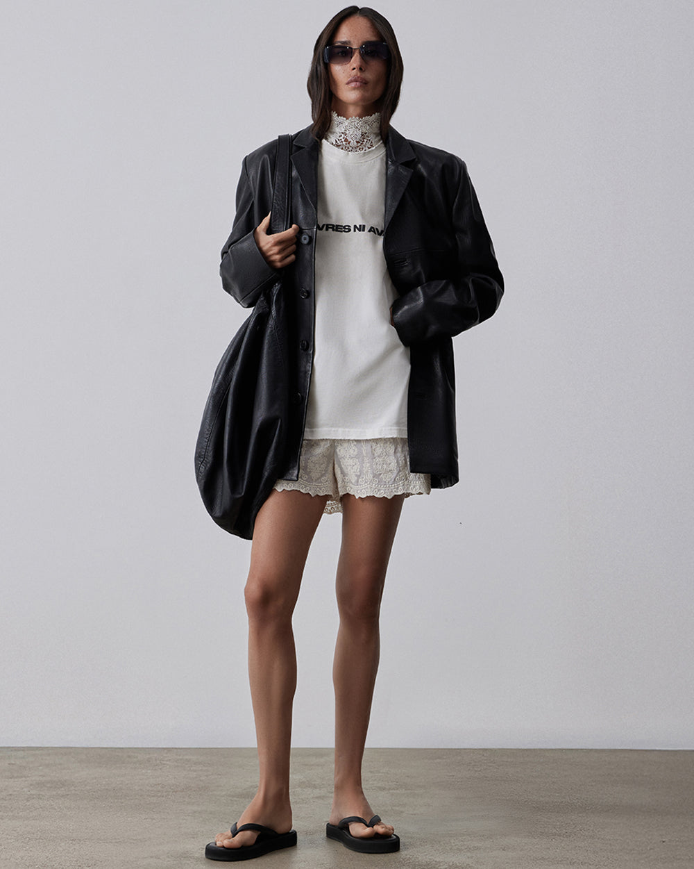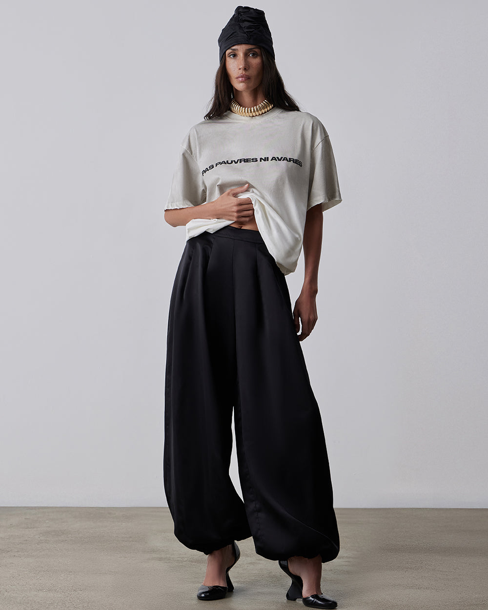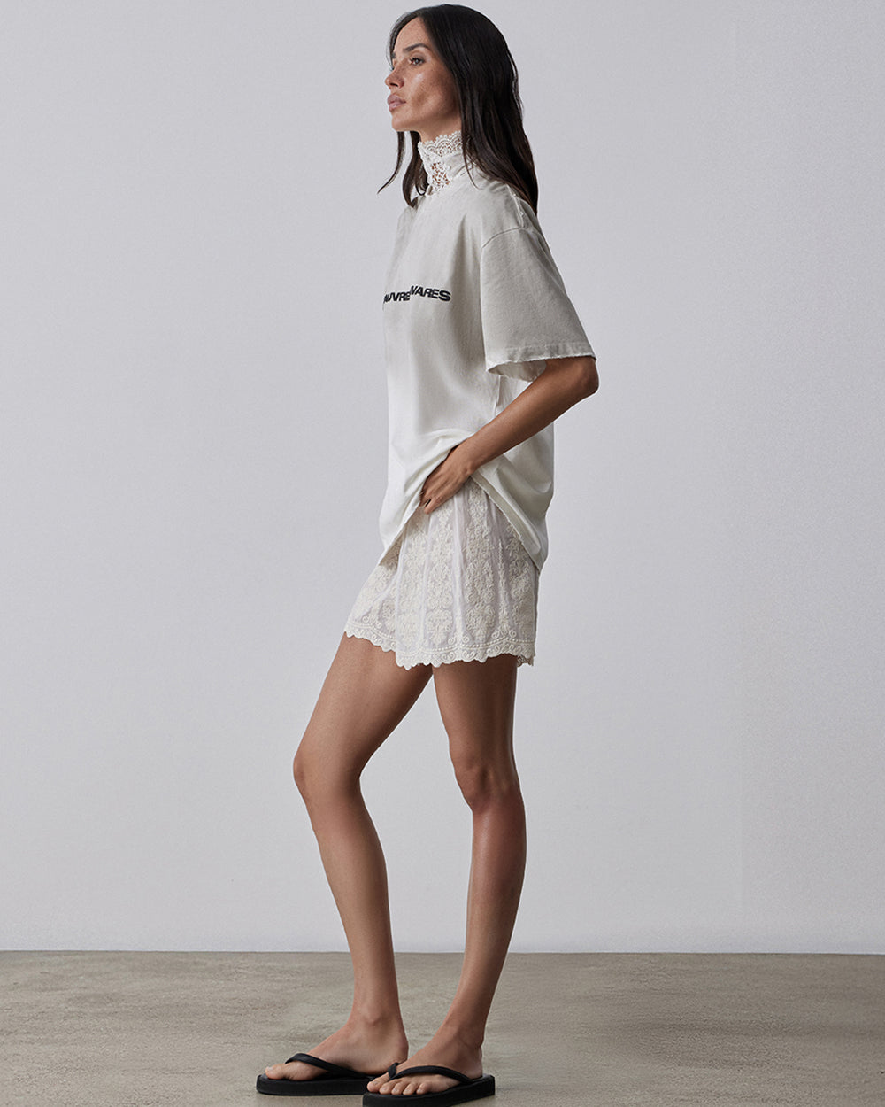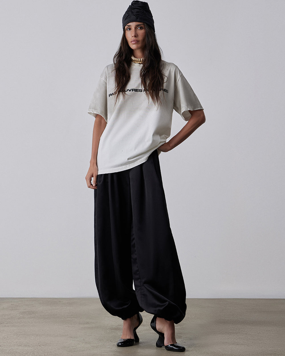 A relaxed cotton t-shirt in a grunge style featuring a gradient white-to-grey print. Lightweight and versatile, this easy-to-wear design fits effortlessly into any outfit, adding a distinctive touch of brightness and recognition. The lettering is raised above the fabric's surface thanks to an innovative application technique that gives it depth and dimensionality. Decorative slits are scattered across the entire garment and along its hems for added visual interest. Each piece may have slight variations in color intensity or contain subtle lighter/darker streaks resulting from our unique dyeing process.