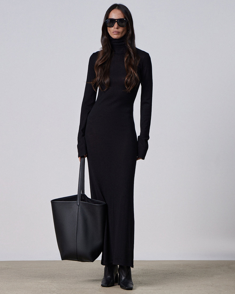 The dress, crafted from a blend of cashmere and silk, embodies minimalism and luxury. The material gently hugs the body, providing a sense of lightness and warmth, while offering a subtle silk sheen.
