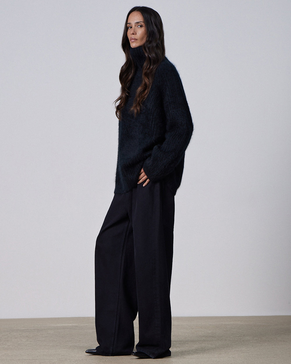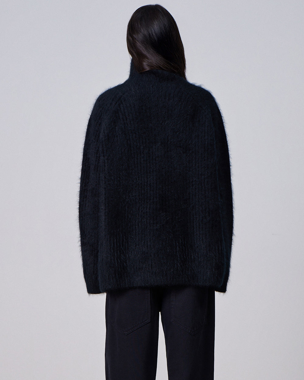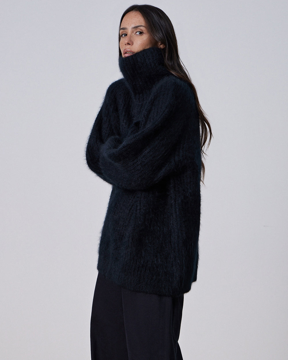 Dense black cashmere sweater with a high stand-up collar. Incredibly warm and incredibly soft to the touch, it protects from cold and wind - but we must warn about one important side effect: everyone around will find their gaze irresistibly drawn towards it. The high density of the yarn used ensures a flawless fit: the static shape resembles a sculpture carved from stone, elegantly framing the face and emphasizing the shoulders' line. At the same time, the cut remains free-flowing and does not restrict movement.