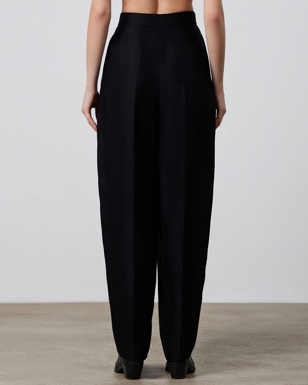 Relaxed tailored banana trousers with front pleats and sharp pressed creases. Crafted from a dense yet breathable silk-blend fabric, they drape fluidly along the leg and fall elegantly over the footwear. Perfect for both evening and tailored looks, especially when paired with the Lady jacket: the softly widened leg through the hips combined with the jacket’s sculptural shoulders creates an hourglass silhouette, highlighting the delicacy of the waist and completing the look with balanced harmony.
