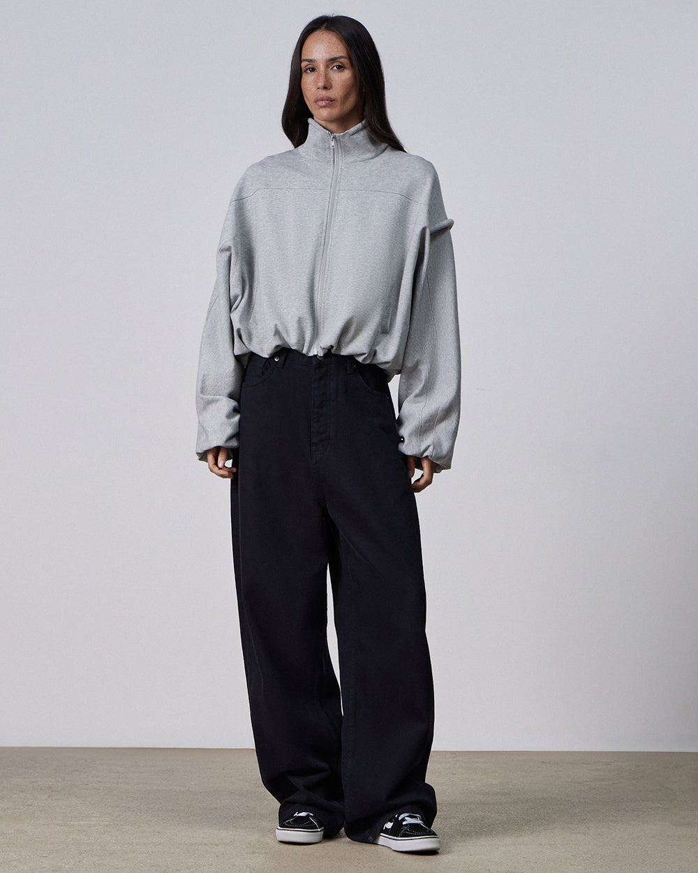 Short sports jacket made from dense blended cotton. Loose and comfortable, it's perfect for everyday casual looks. Gathered hem and cuffs add volume and airiness, helping to emphasize the waistline. Combined with "Rusana" pants, it forms a complete harmonious silhouette.